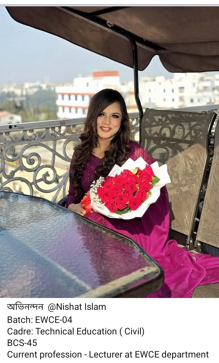 Nishat Islam from Batch EWCE-04 has been selected for the BCS Technical Education (Civil) cadre and is currently serving as a Lecturer in the EWCE Department at MIST. Md. Rifat Chowdhury from Batch EWCE-02 has qualified in the BCS Administration cadre and is currently serving as an Instructor at Khulna Polytechnic Institute. Additionally, Abu Saleh Muhammad Musa from Batch ME-15 has qualified in the BCS Technical Education cadre.