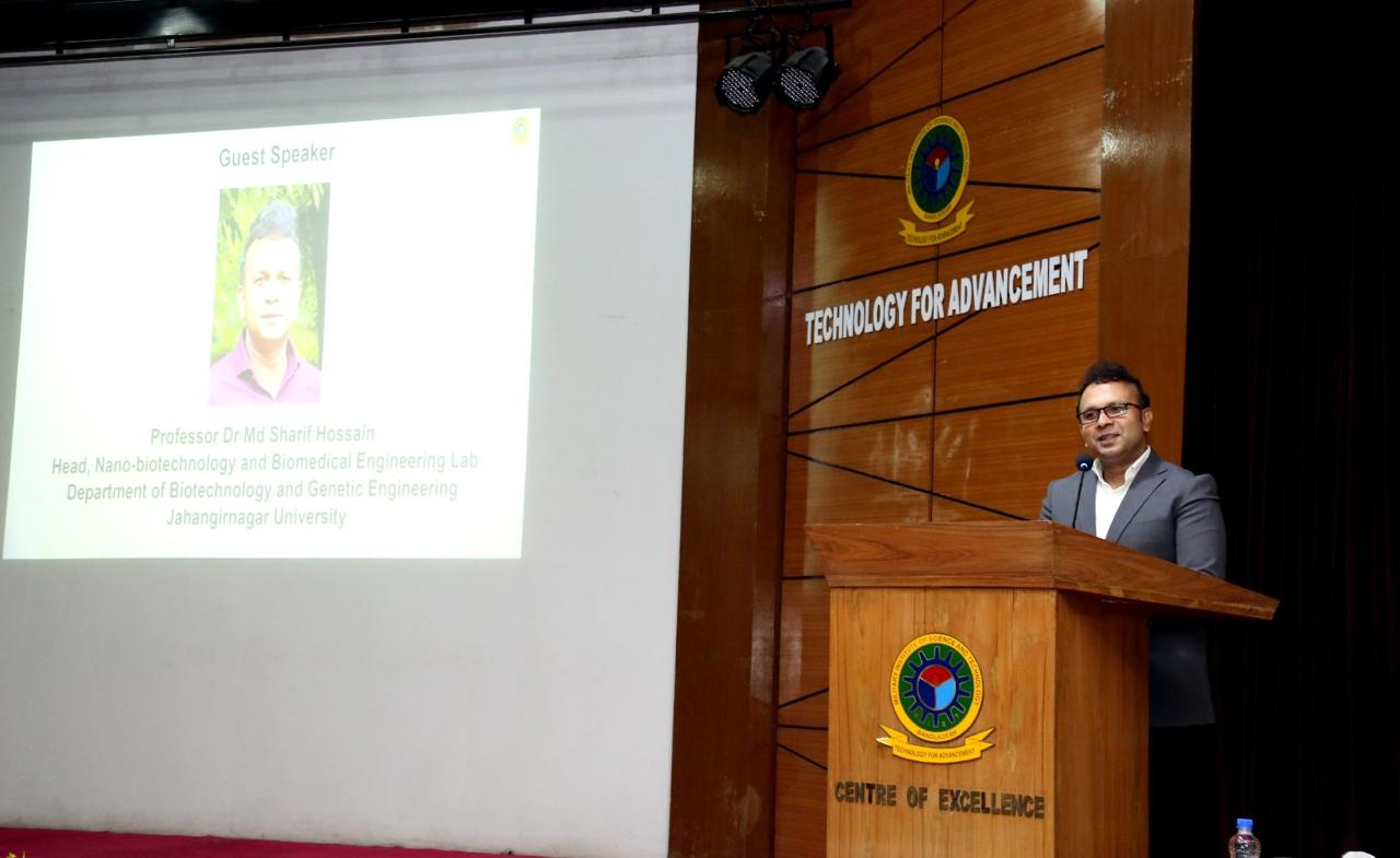 The distinguished guest speaker, Prof Dr. Md. Sharif Hossain, Department of Biotechnology and Genetic Engineering, Jahangirnagar University, presented his pioneering research on the applications of nanotechnology in clinical practice and its transformative role in healthcare. His talk covered how engineering at the nanoscale enables diagnostics, targeted drug delivery, advanced imaging, and regenerative therapies, allowing treatments to be more precise, efficient, and less invasive. Nanostructures and nanomaterials, by virtue of their unique physicochemical properties, can also help overcome challenges such as drug resistance, side-effects, and early detection of diseases.